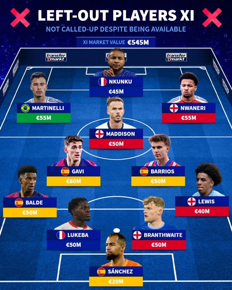 落第国度队声势(总价5.45亿欧,不包含伤缺球员):