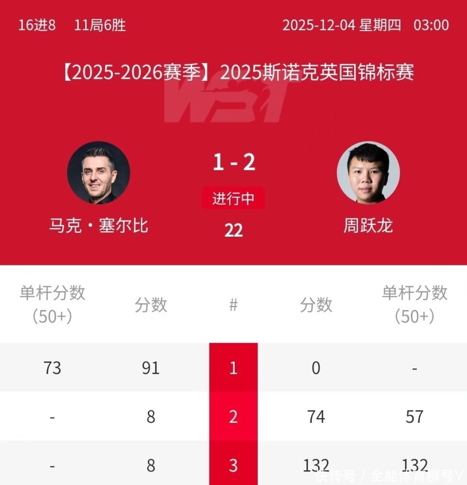 北京手艺12月4日凌晨音尘体育录像/图片,2025年斯诺克英锦赛络续进行。正在进行的1/8的一场焦点比赛中,中国名将周跃龙迎战4届世锦赛冠军马克-塞尔比,第三局放置后,他以2-1超过敌手。第一轮,周跃龙以6-4爆冷淘汰7“火箭”罗尼-奥沙利文。