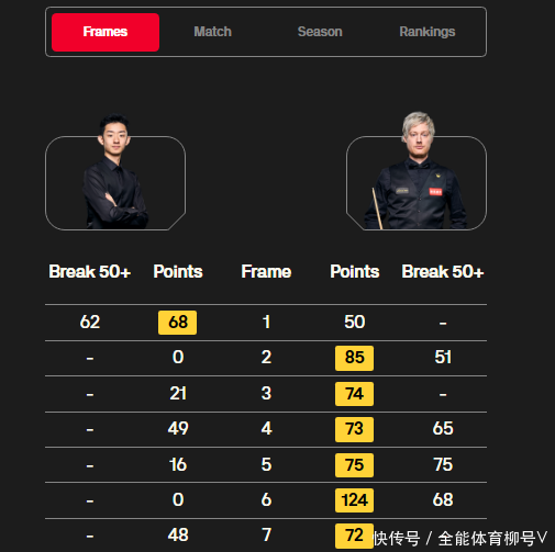 第四局,吴宜泽捏续发力,他又送出单杆82,82-0再次零封霍尔特,比分上风扩大到扩大到4-0。第五局,吴宜泽以81-0零封霍尔特。比分上风酿成5-0,并取得五个赛点。