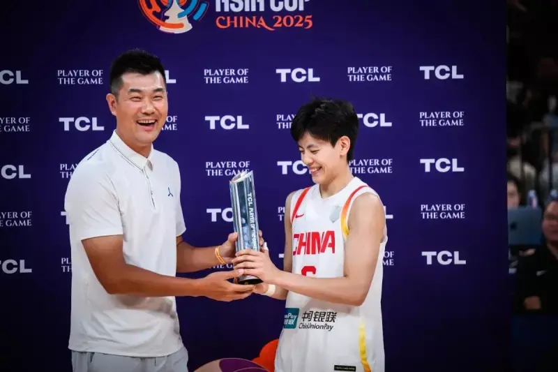 杨舒予荣膺本场最好球员,赛后经受中国男篮名宿王仕鹏颁发的奖杯。